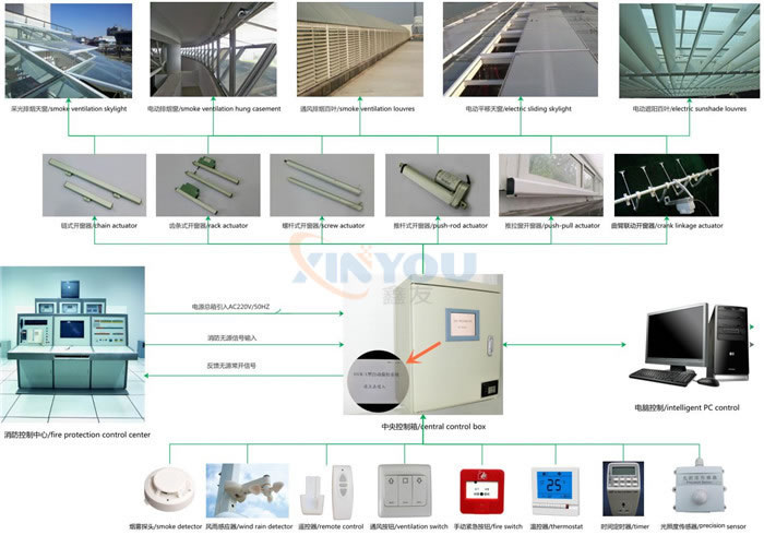 智能通風控制系統由智能控制箱、墻裝開關、遙控器、風雨感應器、開窗器等組成,用戶可根據日常室內環境的變化,通過遙控器或者開關來對窗戶進行開啟和關閉的控制。